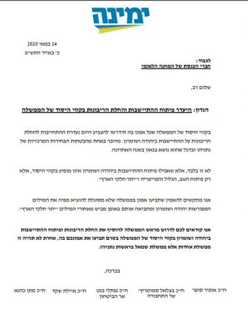 במכתב, עליו חתומים חברי הכנסת נפתלי בנט, איילת שקד, בצלאל סמוטריץ׳, מתן כהנא ואופיר סופר, נכתב כי "בקווי היסוד של הממשלה שעל אמון בה תידרשו להצביע היום נעדרת ההתחייבות להחלת הריבונות על ההתיישבות ביהודה ושומרון. מדובר באחת מהבטחות הבחירות המרכזיות של נתניהו ובדגל שהוא נושא בגאון בשנה האחרונה".