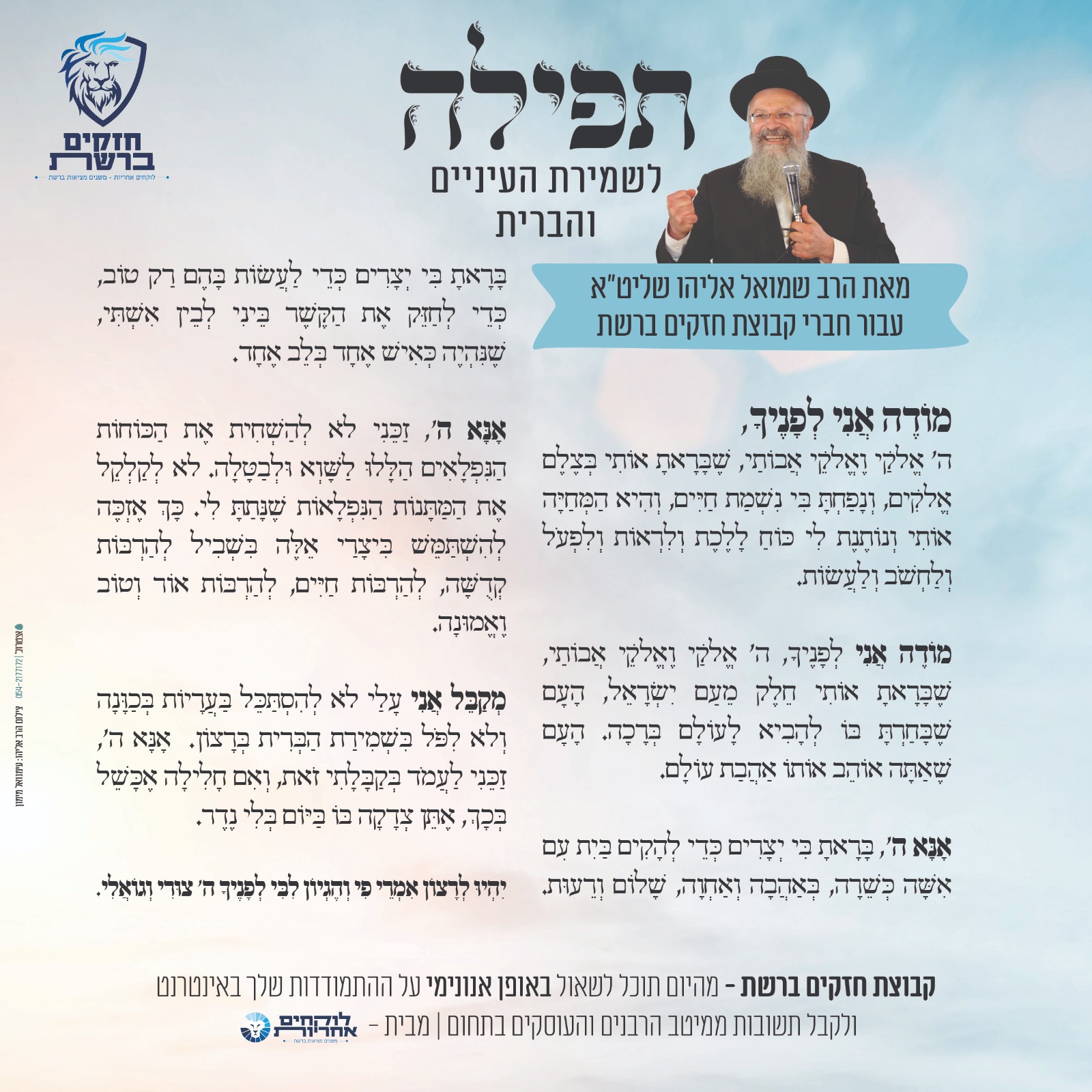רבה של העיר צפת וחבר מועצת הרבנות הראשית לישראל, הרב שמואל אליהו, חיבר תפילה מיוחדת להתחזקות בשמירת העיניים והברית. התפילה חוברה לבקשת קבוצות 'חזקים ברשת' מבית ארגון 'לוקחים אחריות'.