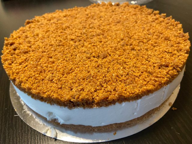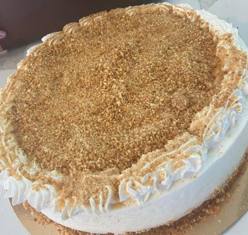 העוגה: מדובר בעוגת גבינה קרה ביתית עם תחתית וציפוי של קראמבל חמאה וקרמל. עוגת בייסיק שהפתיעה.