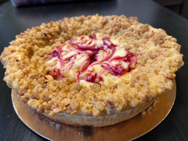 העוגה: בסיס של עוגיות חמאה, קונפיטורת פטל ביתית, קרם גבינת ריקוטה וציפוי שטרוייזל שקדים. חמאה בשילוב גבינות שמנת מעודנות וטעימות ופטל מנקר עיניים.