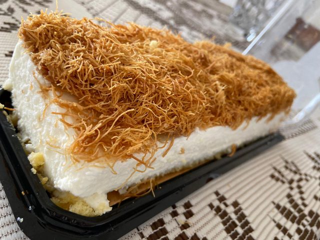 העוגה: מוס גבינה בשילוב טוויסט של שערות קדאיף קריספיות. הנראות מפתה וקוסמת לכל חובב הקדאיף.