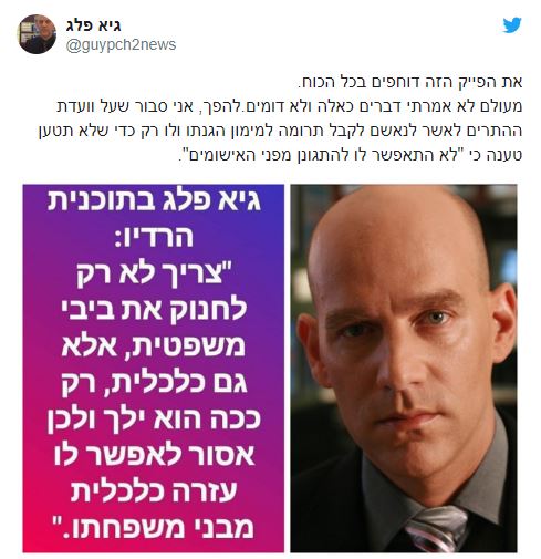 ברשתות החברתיות מופץ צילום מסך בו נכתב: "גיא פלג בתכנית הרדיו: צריך לא רק לחנוק את ביבי משפטית, אלא גם כלכלית, רק ככה הוא ילך ולכן אסור לאפשר לו עזרה כלכלית מבני משפחתו".