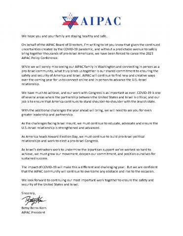 השדולה הפרו ישראלית, איפא"ק, הודיעה כי היא מבטלת את הכנס השנתי שלה בשל המצב הרפואי עקב התפשטות נגיף הקורונה בעולם.