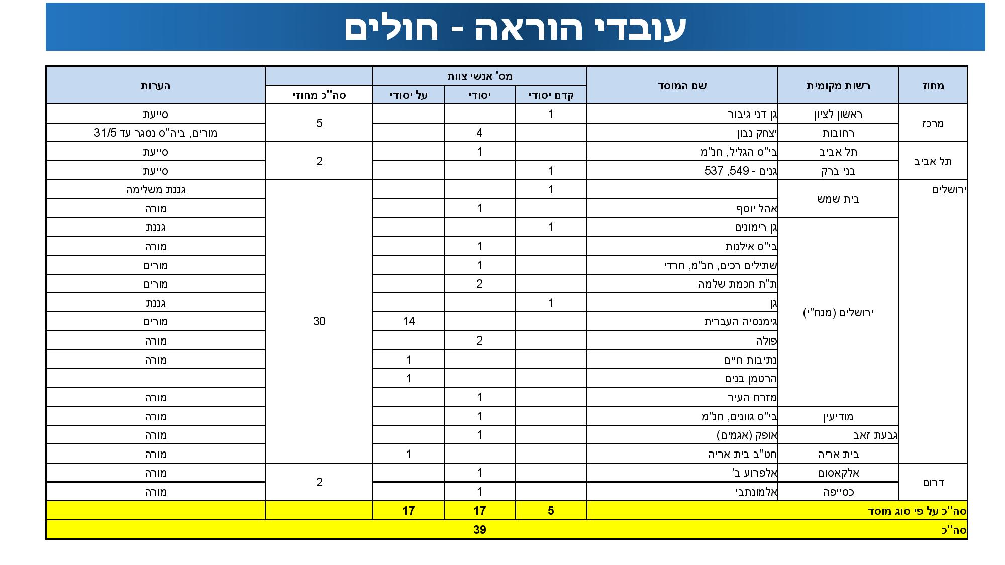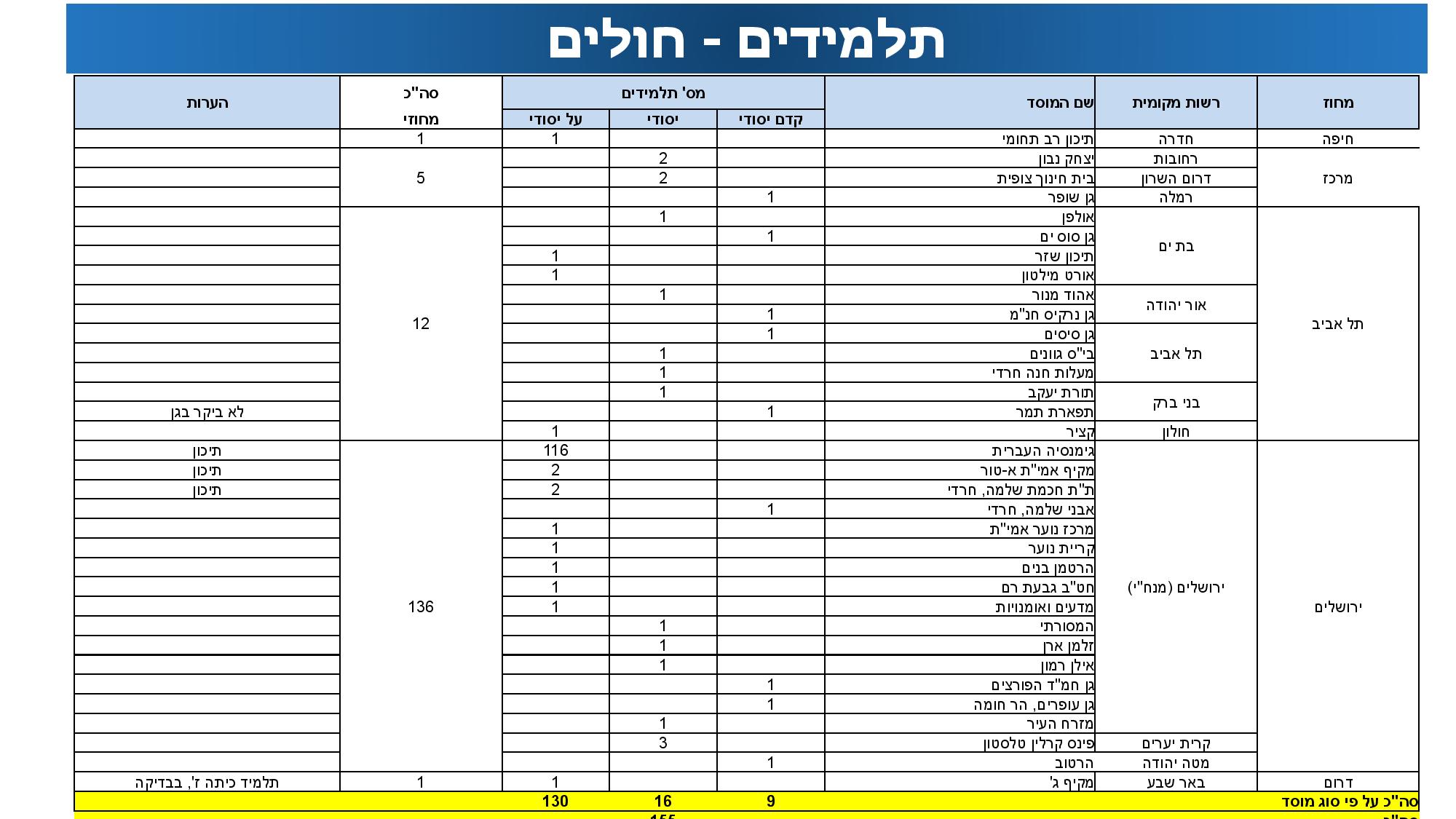 במצבת החולים, בסך הכל יש 155 תלמידי תיכון, יסודי וגן שהתגלו כחיוביים לבדיקת הקורונה. בנוסף עוד 39 מורים וצוותי הוראה שחולים.