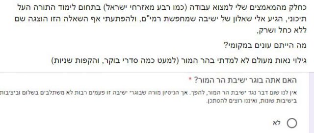 ישיבת הסדר שהחלה בחיפוש ר"מים לשנת הלימודים הבאה פרסמה שאלון למועמדים פוטנציאליים בכדי לייצר סינון ראשוני לפני השלב הבא בתהליך הקבלה לעבודה בישיבה, עם זאת אם אתה בוגר ישיבת 'הר המור' אתה לא יכול להתקבל לעבודה בישיבה, כך לפחות על פי השאלון.