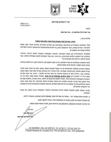 השר רפי פרץ הגיש היום (חמישי) לשר הבריאות, יולי אדלשטיין, הסתייגות על תקנות הקורונה שיעלו לממשלה ביום ראשון, וזאת כיוון שלדבריו הטלת קנס על בעל העסק בשל עבירה שביצע הלקוח היא פגיעה מופרזת ובלתי מוצדקת.