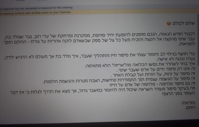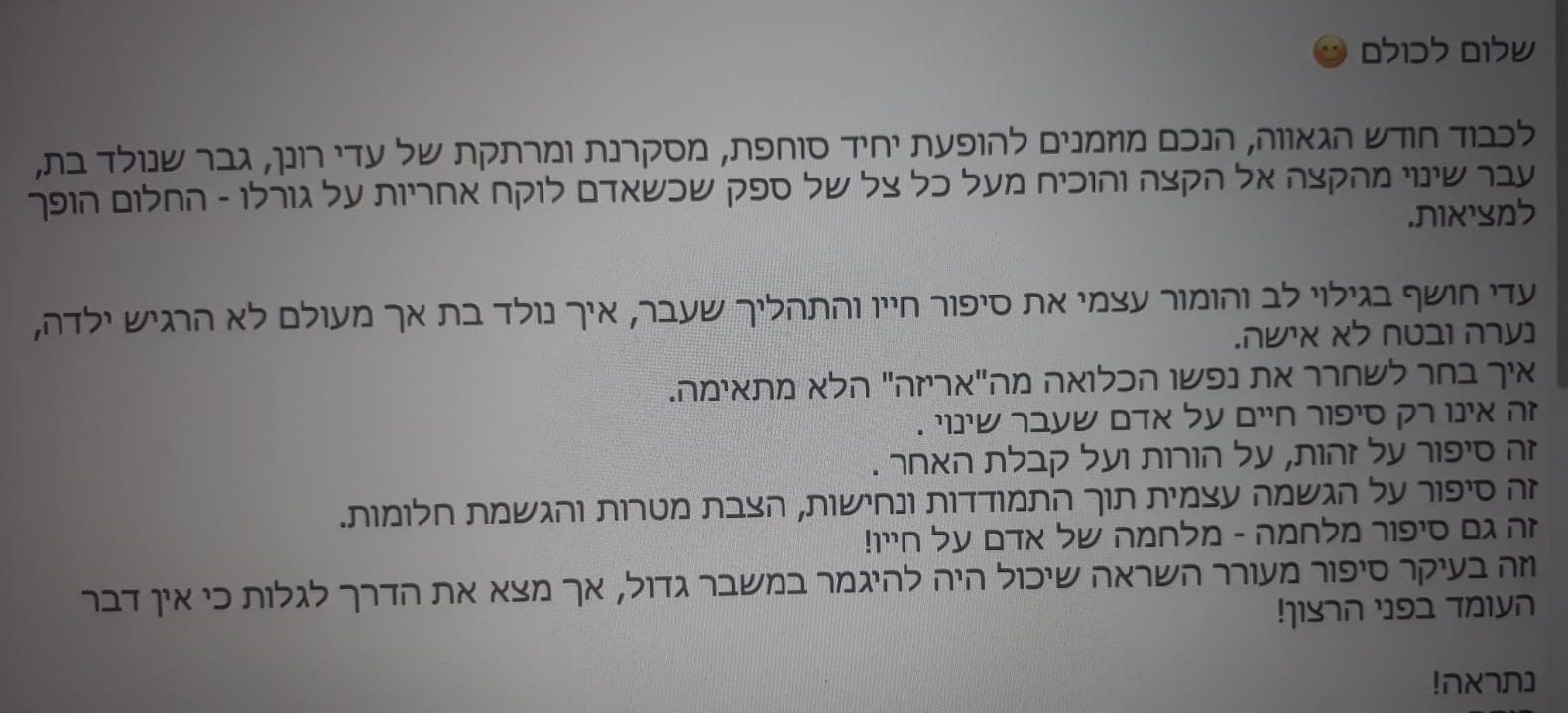 קיבלתי הזמנה מהעבודה לבוא ולשמוע הרצאה של "גבר שנולד בת, עבר שינוי מהקצה אל הקצה והוכיח מעל כל צל של ספק שכשאדם לוקח אחריות על גורלו – החלום הופך למציאות".