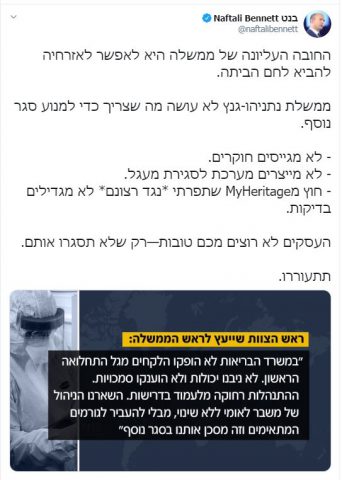 יו"ר ימינה נפתלי בנט, ממשיך הערב (שלישי) במתקפות על ראשי הקואליציה ראש הממשלה נתניהו ויו"ר כחול לבן בני גנץ, שלא נערכים לגל השני של הקורונה.