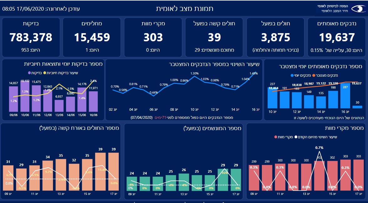 בתוך כך מפרסם המטה לבטחון לאומי נתונים על הקורונה, 287 חולים חדשים נתגלו אתמול, המספר הגדול ביותר של חולים מאז אפריל. מספר החולים קשה קפץ גם הוא ל-39, ומספר המונשמים עלה ל-29. עד כה נפטרו בישראל מהנגיף 303 בני אדם.