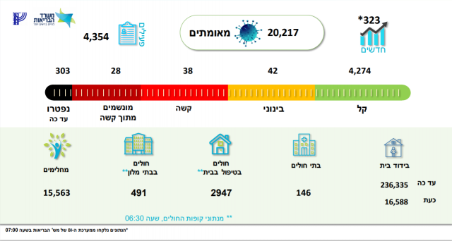משרד הבריאות הודיע כי ביממה האחרונה אובחנו 349 נדבקים חדשים בנגיף הקורונה, זהו המספר הגבוה ביותר מאז סוף חודש אפריל שמספר הנדבקים עלה על 300, ביניהם 38 במצב קשה ו-28 מונשמים. מספר הנדבקים עומד על 20,217 ואילו מספר המחלימים עלה ל-15,563.