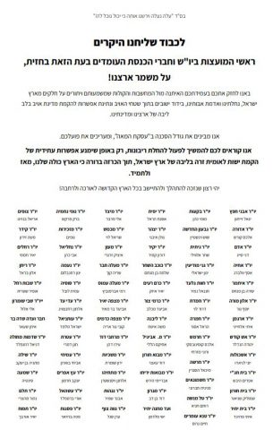 בין היישובים החתומים: אלון מורה, חשמונאים, אדם, עתניאל, רחלים, עץ אפרים, מתתיהו, כוכב השחר, בית חורון, גני מודיעין, עטרת, כרמי צור ועוד.