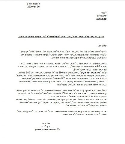 בעקבות המצב, פנה אמש פנה ח"כ יבגני סובה מ"ישראל ביתנו" לשר החינוך יואב גלנט, בנוסף למכתב ששלח כאמור לובה. במכתביהם, הם מבקשים משר החינוך לטפל בנושא ולתקן את החלטת משרד החינוך השגויה לכאורה, שבה נוצר חוסר שוויון בין תושבים מאותו יישוב.