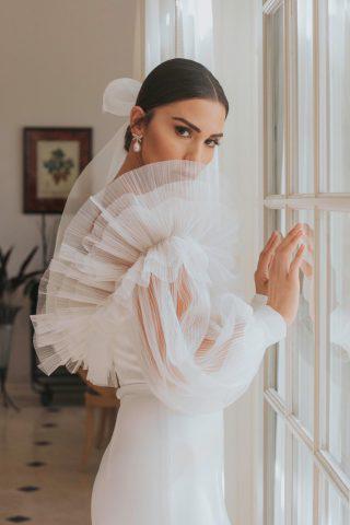 הפעם נבחרה שמלת כלה שעוצבה במיוחד עבורה, בשילוב קרושה צחורה ומחוך בעל שרוולים תפוחים מטאפט. דגם שמסתמן שיהיה מבוקש ביותר בעונת החתונות הקרובה.