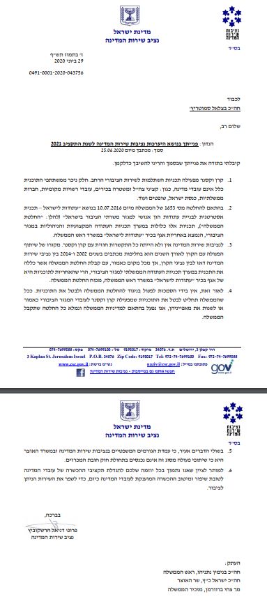 "לאור זאת", מסביר הרשקוביץ' הוא לא יכול למנוע את הפעילות הבעייתית של קרן וקסנר. "אין בידי הסמכות לפעול בניגוד להחלטת הממשלה ולבטל את התוכניות", כתב במכתבו. ומפנה את הכתובת אל ראש הממשלה נתניהו: "ככל שהממשלה תחליט לבטל את התוכניות שמפעילה קרן וקסנר לעובדי המגזר הציבורי, או לשנות את מאפייניהן אלו, נפעל בהתאם למדיניות הממשלה ונמלא כל החלטה שתקבל הממשלה".