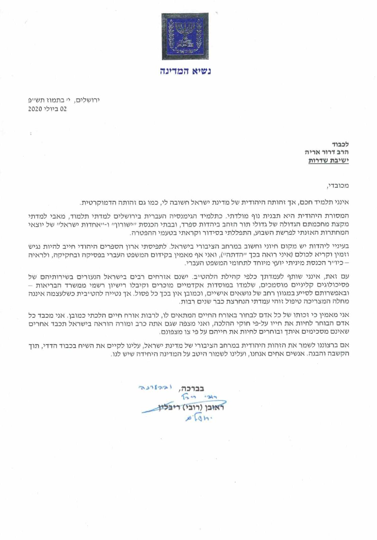 כעת, במכתב ששיגר לרב אריה והגיע לידי סרוגים כותב ריבלין: "מכובדי, אינני תלמיד חכם, אך זהותה היהודית של מדינת ישראל חשובה לי, כמו גם זהותה הדמוקרטית".