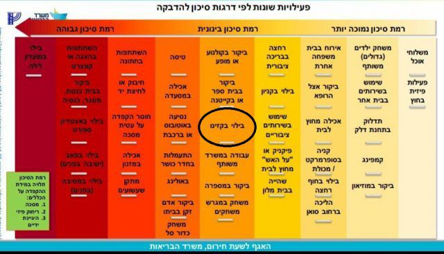 פאדיחה למשרד הבריאות. כחלק מהניסיון להסביר לציבור כיצד להתגונן עצמאית מפני הקורונה, הם פרסמו הבוקר מסמך צבעוני ובו רמת הסיכונים בפעילות שונות.