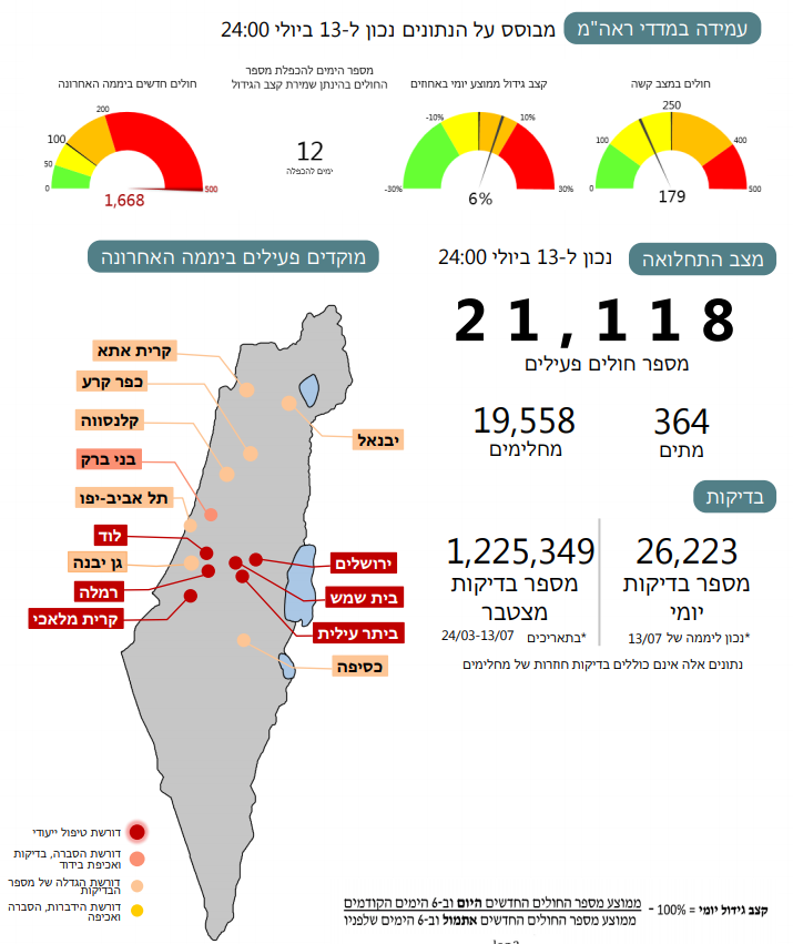 מנתוני מרכז המידע והידע הלאומי למערכה בקורונה עולה כיאתמול נתגלו בארץ 1,668 נדבקים חדשים, המספר היומי הגבוה ביותר מאז תחילת משבר הקורונה. אחוז הבדיקות החיוביות זינק גם הוא ל-6.75%, קרוב מאוד למספרי הגל הראשון, שם נערכו בדיקות בצורה מצומצמת.