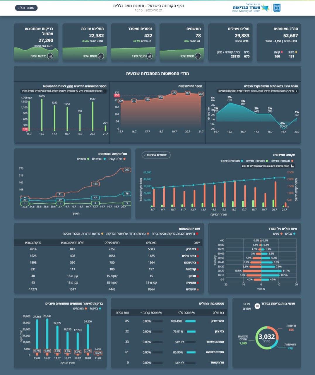 בסך הכל נדבקו בישראל  52,687 אנשים מפרוץ המגפה, 22,382 כבר החלימו, כך שבסך הכל יש כעת 29,883 חולים, ועד סוף היום מספר החולים הפעילים צפוי לעבור את ה-30,000.