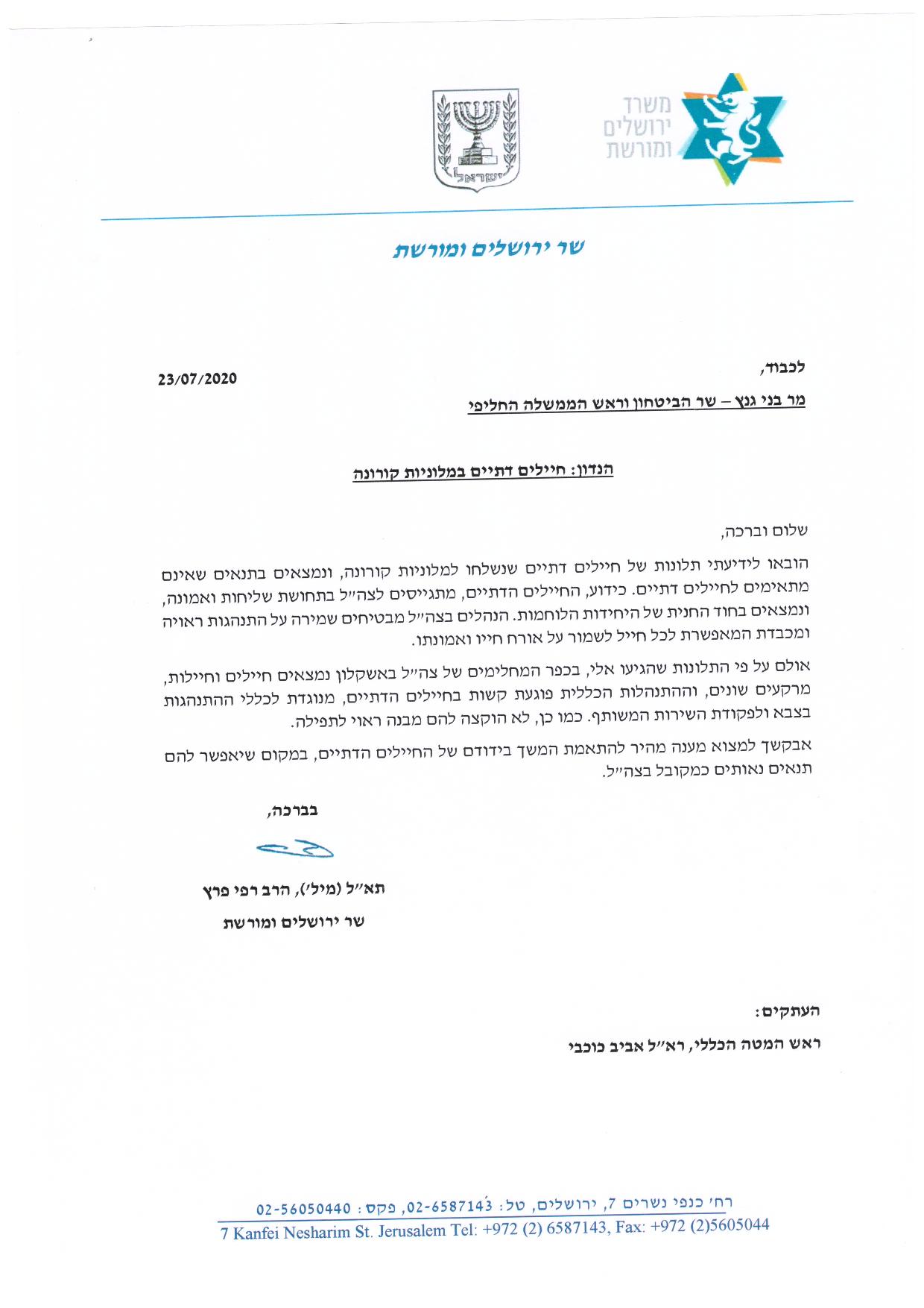 שר ירושלים ומורשת הרב רפי פרץ שלח הבוקר (ה') מכתב דחוף לשר הבטחון וראש הממשלה החליפי בני גנץ ולרמטכ"ל רב-אלוף אביב כוכבי בדבר ההתנהלות במלונית הקורונה באשקלון בין חיילים לחיילות אשר פוגעת באורח חייהם של החיילים הדתיים השוהים במקום.