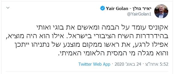 "אקוניס עומד על הבמה ומאשים את בוגי ואותי בהידרדרות השיח הציבורי בישראל. אילו הוא היה מוציא, אפילו לרגע, את ראשו מישבנו של נתניהו ייתכן והוא מגלה מי המסית הלאומי האמיתי."