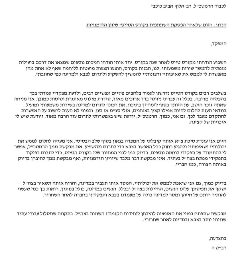 ה', התקבלה לקורס טיס ושירתה שם בהצטיינות, עד שנפלה מהמשך הקורס, כפי שקורה לעשרות רבות של פרחי טיס. במכתב ששלחה לרמטכ"ל היא קובלת על כך שבעוד חבריה לקורס הגברים יכולים להתמיין לתפקידי לוחמים ביחידות העילית של צה"ל.