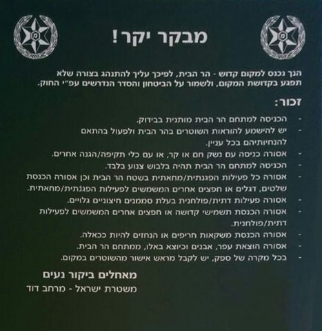 בנוגע לסמכות הצבת השלט, ממשטרת ישראל נמסר: "במסגרת ביקורים המתקיימים כסדרם בשטח הר הבית, פועלת המשטרה בהתאם לתנאי הביקור הנהוגים במקום ומועברים בטרם כניסת המבקרים לשטח ההר".