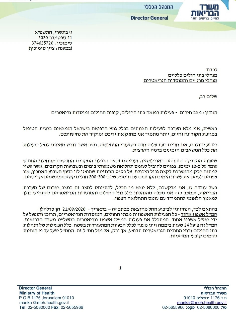 "אני מבקשכם, ללא יוצא מן הכלל, להתייחס למצב זה כמצב חירום של מערכת הבריאות, וכמצב כזה אני מצפה מהנהלות כלל בתי החולים והמוסדות הגריאטריים להתגייס כולן למאמץ הלאומי להתמודד עם עומס התחלואה הצפוי".
