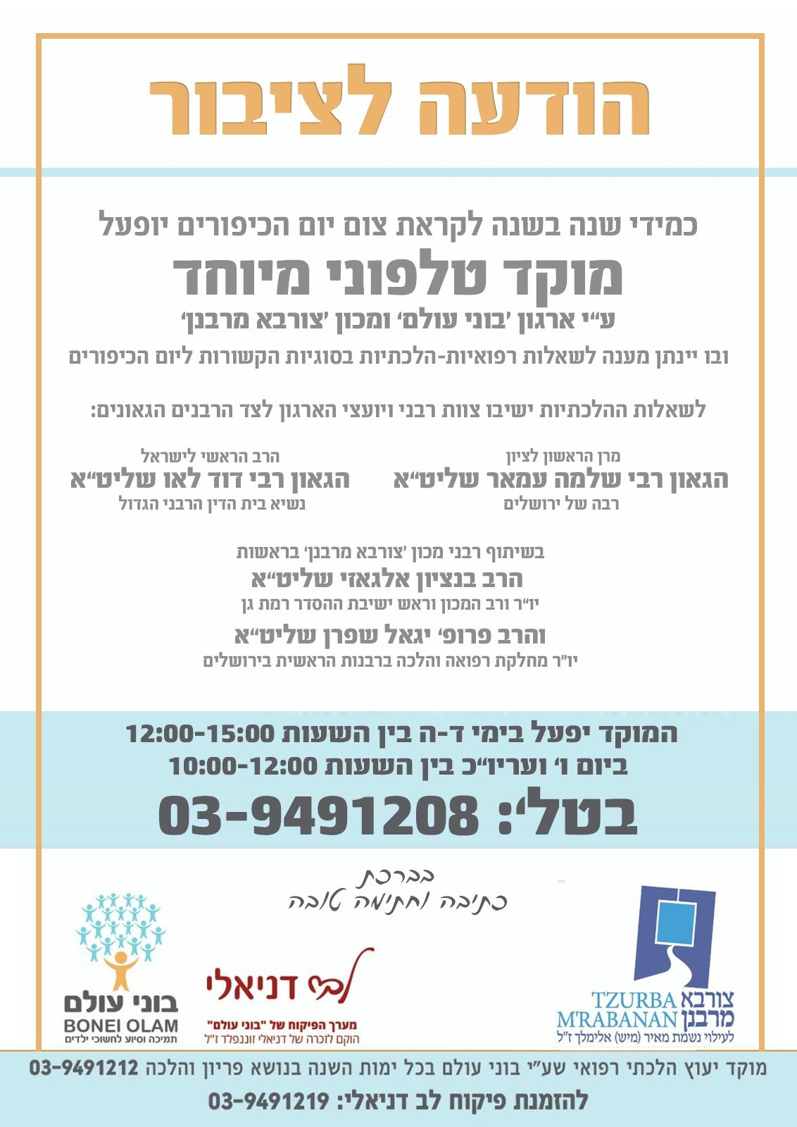 המוקד הטלפוני יפעל בימים רביעי וחמישי בין השעות 12:00 ל-15:00 בטלפון 03-9491208