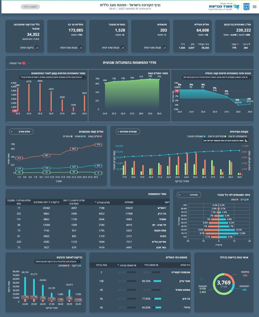 נכון להיום נתגלו בישראל 239,222 מאומתים מפרוץ המגפה. מתוכם כ-64,000 חולים פעילים, רובם במצב קל מאוד. 779 חולים שמצבם מוגדר קשה. 203 מונשמים. 1,528 נפטרים במצטבר מפרוץ המגפה.
