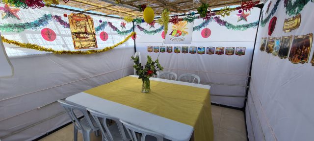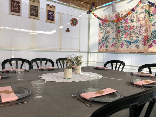 קישוטים home made או קנויים? "ברור שhome made. רציתי לקנות נייר קרפ, אבל הכל סגור. אז יצרתי שרשרות ממגזין כלות ששכב אצלי בבית (יש הרבה דפים עם פרחים וצבעים בוהקים). יש לנו אושפיזות בסוכה, כי למה מזמינים רק גברים?"