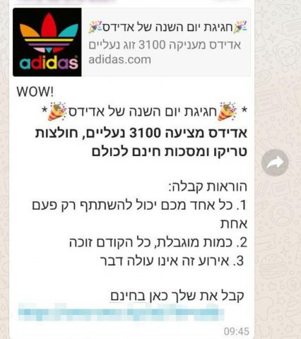 הונאת רשת חדשה מופצת בימים האחרונים בוואטסאפ וברשתות החברתיות, במסגרתה ישראלים רבים התבשרו בהודעה על מבצע חדש של חברת אדידס המציעה להם זוגות נעליים בחינם. בפועל מדובר בתרמית שנועדה לאסוף פרטים אישיים מהמשתמשים – ובמקביל קוראת להם להעביר את ההודעה על ההונאה לחבריהם.