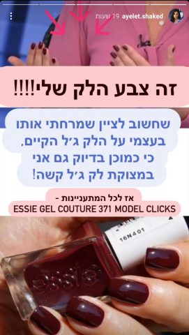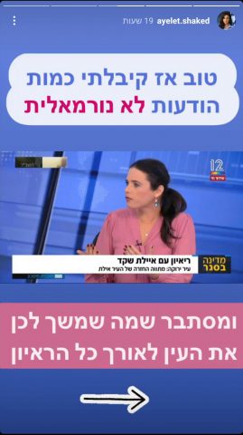 חברת הכנסת, איילת שקד העלתה בחשבון האינסטגרם שלה, קטע מראיון שהעניקה באולפן חדשות 12. בשונה מכותרות פוליטיות והסברים מדיניים, השרה לשעבר נתקלה בעשרות שאלות מצד צופות על דבר אחד בלבד.