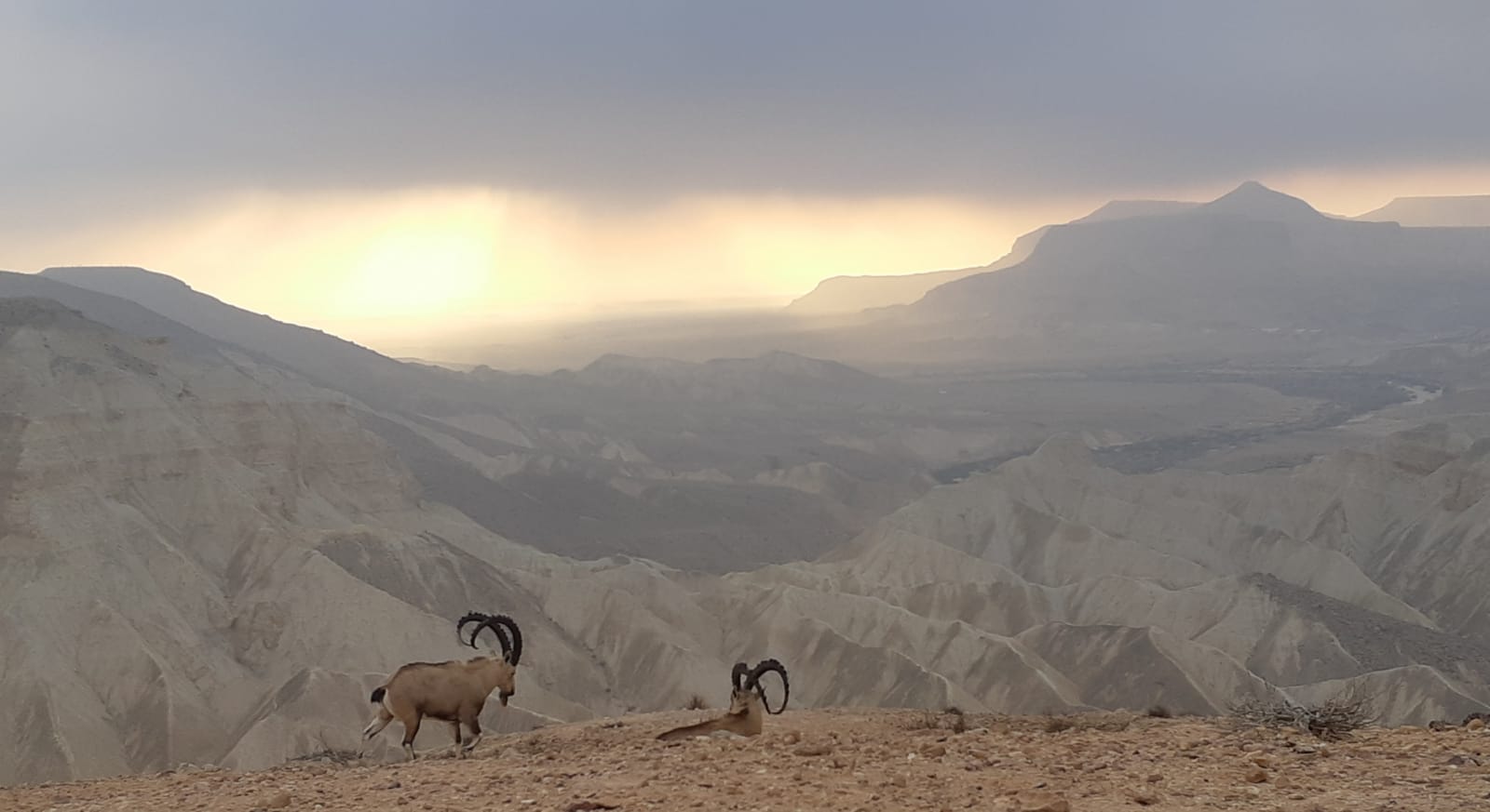 על רקע ענני הסתיו, נצפה במדרשת בן גוריון הבוקר (א') עדר יעלים במצוקי המדבר.