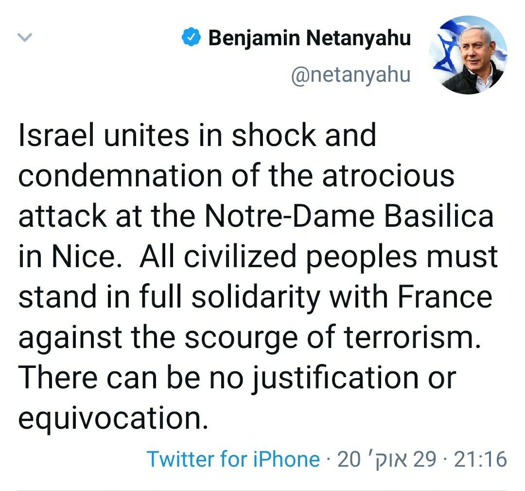 אגב, למרבה האירוניה, נתניהו עצמו גם צייץ תוך כדי דיון בקבינט, חצי שעה קודם לכן, תנחומים לצרפתים בעקבות הפיגוע הרצחני בעיר ניס.