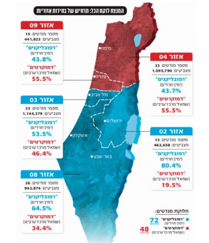 בסיכום הנתונים, לו הבחירות בארץ היו נערכות בשיטה האמריקנית – שבה כל המנדטים הולכים לזוכה האזורי – מפלגות הימין היו מסיימות עם 72 מנדטים, אל מול 48 לשמאל מרכז.