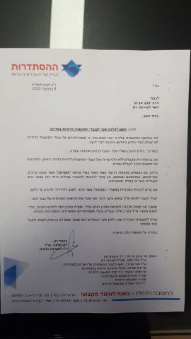 גם יו"ר החטיבה הדתית בהסתדרות, רפי מלאכי, שלח הבוקר מכתב לשר אביטן ובו הוא מבקש למצוא פתרון מתאים אפילו זמני, בכדי למנוע משבר גדול של אלפי עובדים ומשפחותיהם. מלאכי כתב לשר משאם לא ימצא פתרון ההסתדרות תאלץ להתחיל בהליך משפטי נגד המשרד.