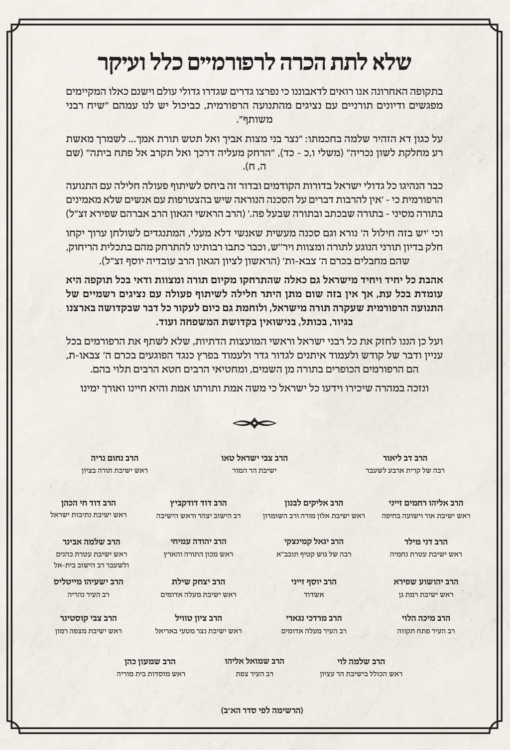 לסיום קראו "ועל כן הננו לחזק את כל רבני ישראל וראשי המועצות הדתיות, שלא לשתף את הרפורמים בכל עניין ודבר של קודש ולעמוד איתנים לגדור גדר ולעמוד בפרץ כנגד הפוגעים בכרם ה' צבאות, הם הרפורמים הכופרים בתורה מן השמים, ומחטיאי הרבים חטא הרבים תלוי בהם. ונזכה במהרה שיכירו וידעו כל ישראל כי משה אמת ותורתו אמת והם חיינו ואורך ימינו." סיימו הרבנים.