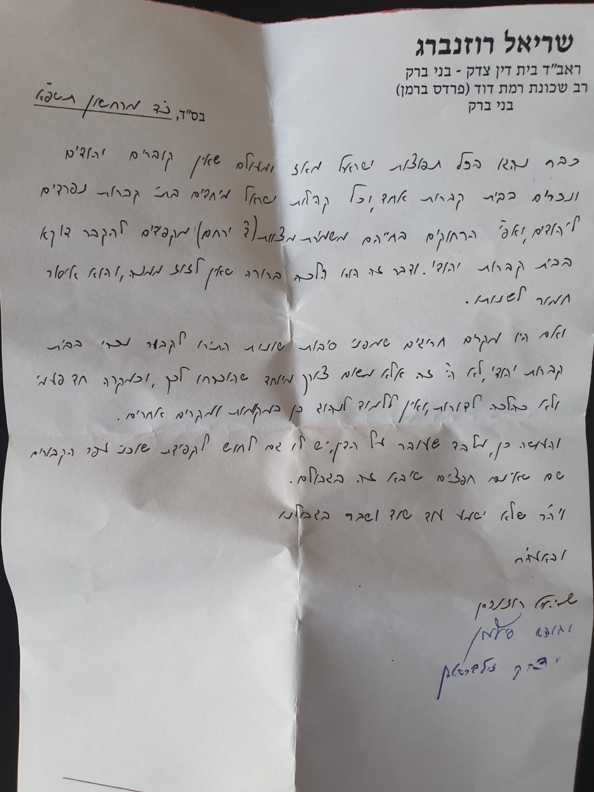 בתוך כך פרסמו שלושה רבנים חרדים מבני ברק, הנחשבים לפוסקים בעולם החרדי, גילוי דעת משלהם, האוסר גם הוא את קבורת