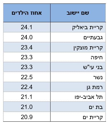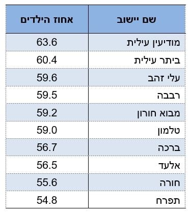 בפילוח של הישובים עולה כי היישוב העירוני עם אחוז הילדים הגבוה ביותר הוא מודיעין עילית (63.6%) ואחריו ביתר עלית (60.4%) ואחריהם הישובים הסרוגים עלי זהב, רבבה, מבוא חורון, טלמון והר ברכה. רק ישוב אחד נמצא בעשיריה הראשונה, חורה בנגב.