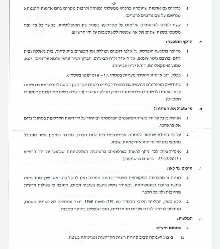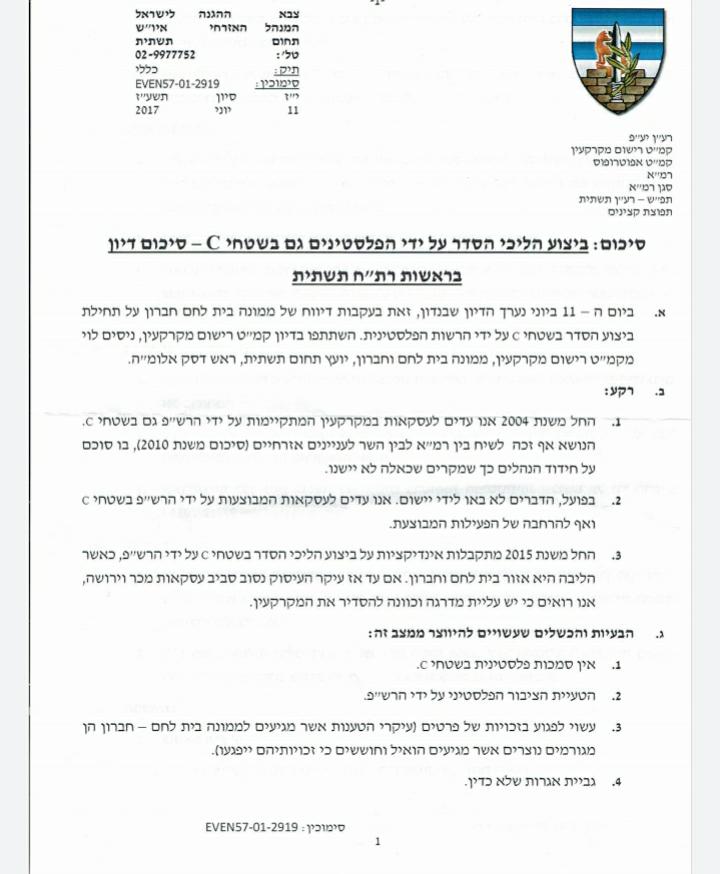"הסדר מקרקעין ורישומן, זוהי פעולה מורכבת השייכת לריבון. מעבר לעובדה שהרשות הפלסטינית עושה בשטחי c כבתוך שלה, בלי תגובה ישראלית משמעותית, הרי שחוסר המעש המביש של מדינת ישראל לרישום מקרקעין ביהודה ושומרון, מהווה גם כשל מוסרי, כשהמדינה אומרת בעצם, איני הריבון בשטח".