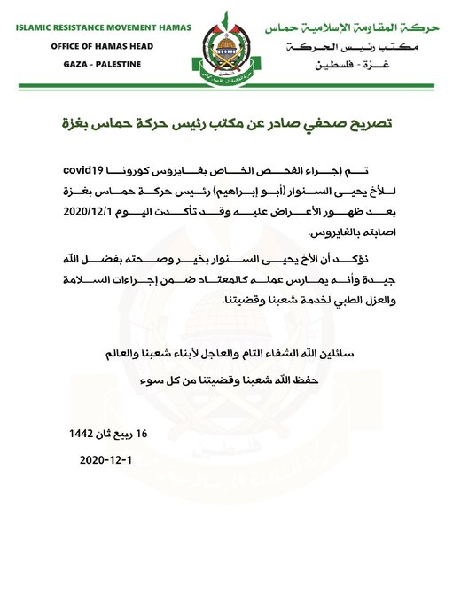 בחמאס מפרסמים כי מצבו טוב והוא ממשיך בעבודתו לפי הנחיות גורמי הרפואה, כשהוא נמצא בבידוד ביתי.