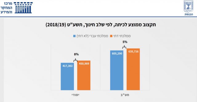 על פי הנתונים, בשכבה ממוצעת בחטיבת ביניים בחינוך הממלכתי-דתי לומדים 45 תלמידים לעומת 90 בחינוך הממלכתי. בשכבה ממוצעת בתיכון בחינוך הממלכתי-דתי לומדים 54 תלמידים לעומת 110 בחינוך הממלכתי. ביחס לטענה כי המוסדות קטנים בגלל פיזור גיאוגרפי ובגלל ההפרדה המגדרית, יש לחדד כי טענה זה נכון רק באזורים בודדים. במרבית אזורי הארץ, הסבר זה אינו מסביר את קוטן המוסדות. מוסד חדש מאושר לעיתים על אף שקיים מוסד מתאים בסביבה הקרובה, והתלמידים שמגיעים למוסד החדש נגרעים מזה הקיים.