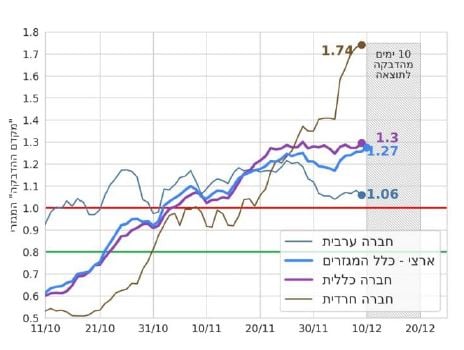 גם אתמול נמשכה המגמה בה במגזר הערבי ניכרת ירידה בשיעורי ההדבקה לעומת המגזר החרדי בה חל זינוק חד למקדם הדבקה גבוה מדי שמשמעותו התפרצות מגפה.