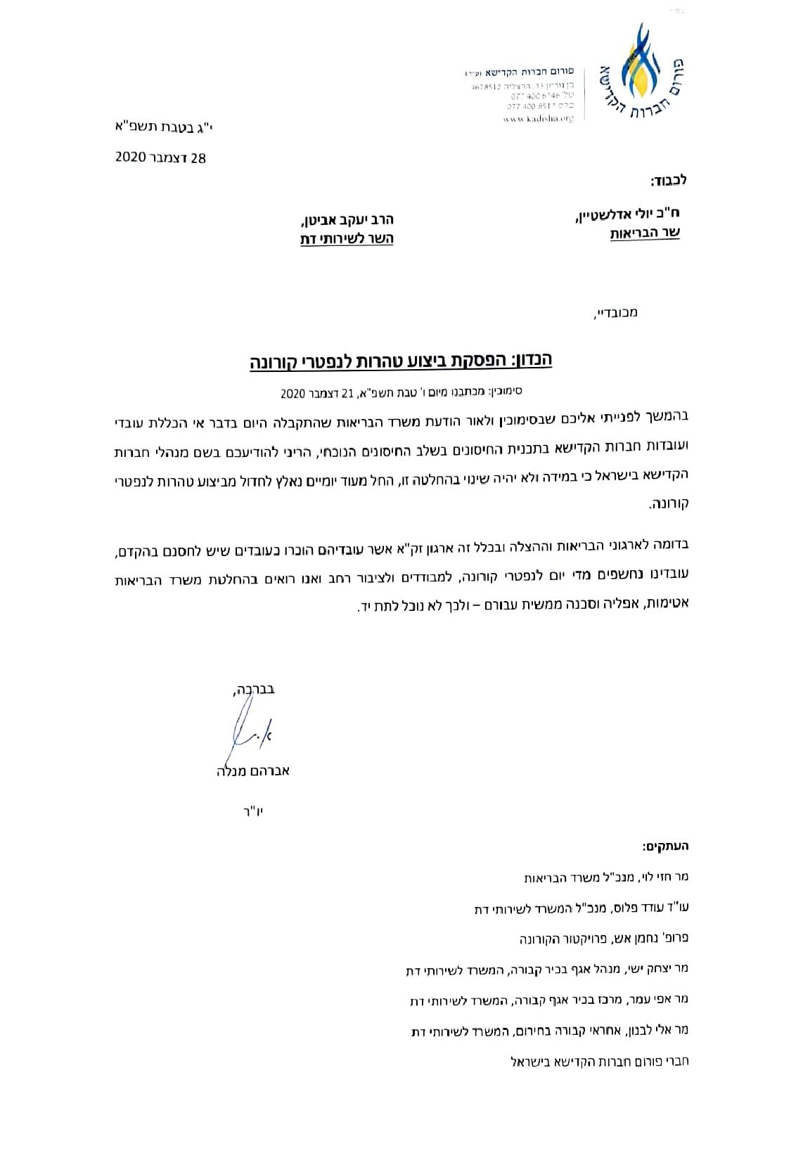 פורום חברות הקדישא פנו במכתב בהול לשר הבריאות, השר לשירותי דת ופרויקטור הקורונה בבקשה לחסן בהקדם את צוותי הקבורה, כעבור שבוע – נענו בשלילה. יו"ר פורום חברות הקדישא: "לאור ההחלטה, לא נוכל לסכן את עובדינו וניאלץ להפסיק לטפל בנפטרי קורונה החל מעוד יומיים"