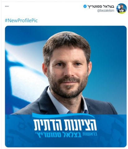 דקות לאחר ההכרזה על ריצה ברשימת 'הציונות הדתית' החליף סמוטריץ' את תמונת הרקע שלו בטוויטר לצילום הפרוספקט של המפלגה, אבל שכח להחליף את תמונת הפרופיל. ככה זה נראה