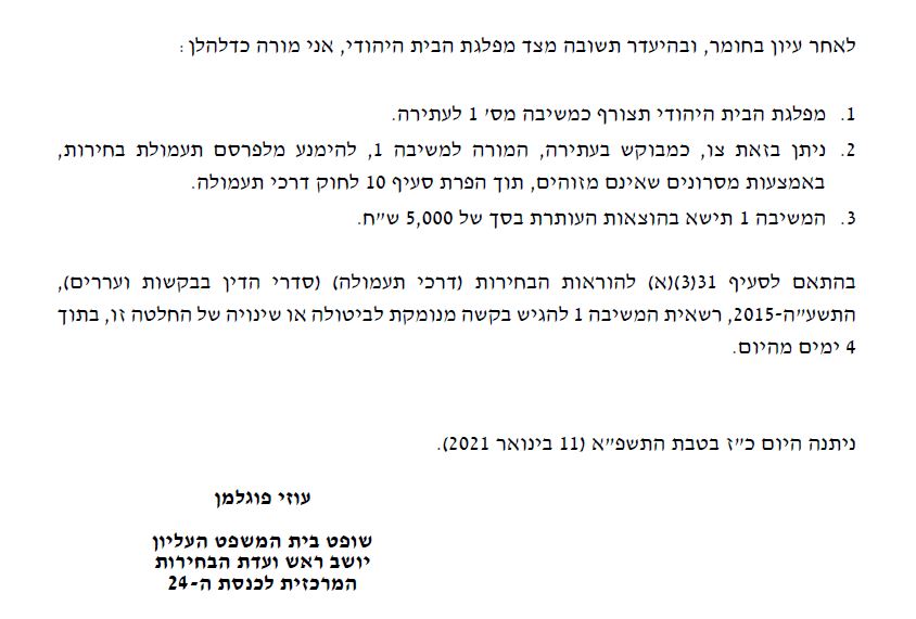 בבחירות הקודמות קבע יו"ר ועדת הבחירות השופט חנן מלצר איסור על שליחת סמסים אנונימיים, וכעת מחליפו פוגלמן ממשיך את האיסור. הבית היהודי לא הגיבה לפניית ועדת הבחירות ולכן צרף השופט פוגלמן את המפלגה כמשיבה לעתירה, השית עליה הוצאות בסך 5,000 ש״ח לאיחוד הלאומי, והוציא צו המורה לה להימנע מלפרסם תעמולת בחירות, באמצעות מסרונים שאינם מזוהים, תוך הפרת סעיף 10 לחוק דרכי תעמולה.