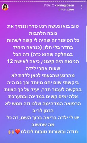 "חשוב לי להגיד לכל מי שמתכננת ללדת באיכילוב – קחו בחשבון שהמחלקות מזעזעות", כתבה גדעון בחשבון האינסטגרם והוסיפה "לא נשמתי אוויר צח על אף שהובטח לי לעבור חדר מהבוקר ועל אף תחנוניי.. ואני עוד 'קורין גדעון' עלק".