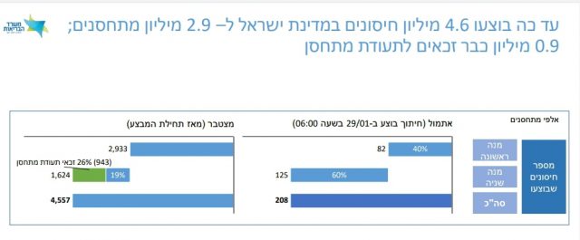 לפי משרד הבריאות, עד כה בוצעו 4.6 מיליון חיסונים במדינת ישראל, כאשר כבר 1.6 מיליון ישראלים כבר קיבלו מנה שנייה. אתמול (ה') בוצעו 208 אלף חיסוני בכל רחבי המדינה.