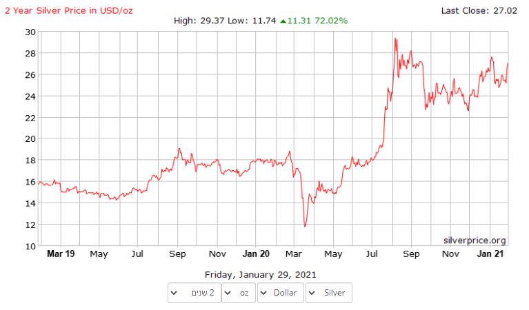 בדיוק בשנה שעברה נפל מחיר הכסף לשפל של כ-12$ לאונקייה, בזמן ששער הדולר היה בערך על 3.50 שקלים לדולר.מאז פרצה הקורונה ומשקיעים חיפשו אפיקי השקעה "בטוחים" ופנו אל "הזהב" ואחריו אל "הכסף". מחיריהם התחילו לזנק מיד לאחר פורים בשנה שעברה.