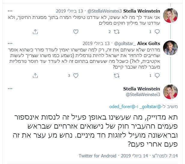 לפני שנתיים התייחס לראיון של יו"ר הבית היהודי שר החינוך הרב רפי פרץ, שהתבטא בטיפולי המרה, ובין השאר אמרה בויכוח בטוויטר: "מה שעשינו באופן פעיל זה לנסות אינספור פעמים להעביר חוק של נישואים אזרחיים שבראש ובראשונה מועיל לזוגות חד מיניים. נחש מי עצר את זה פעם אחרי פעם?"